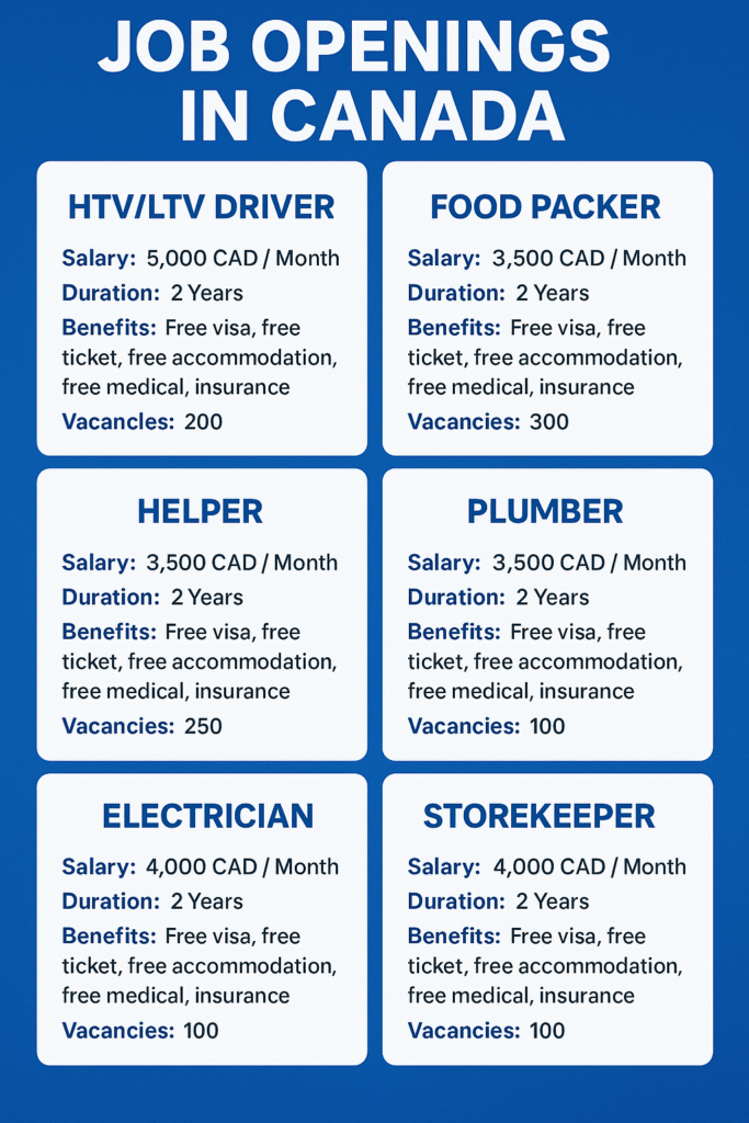We are offering exciting job opportunities in Canada with a contract duration of 2 years. The visa is completely free, including a free air ticket, and selected candidates will also receive free accommodation, medical coverage, insurance, and a monthly bonus.